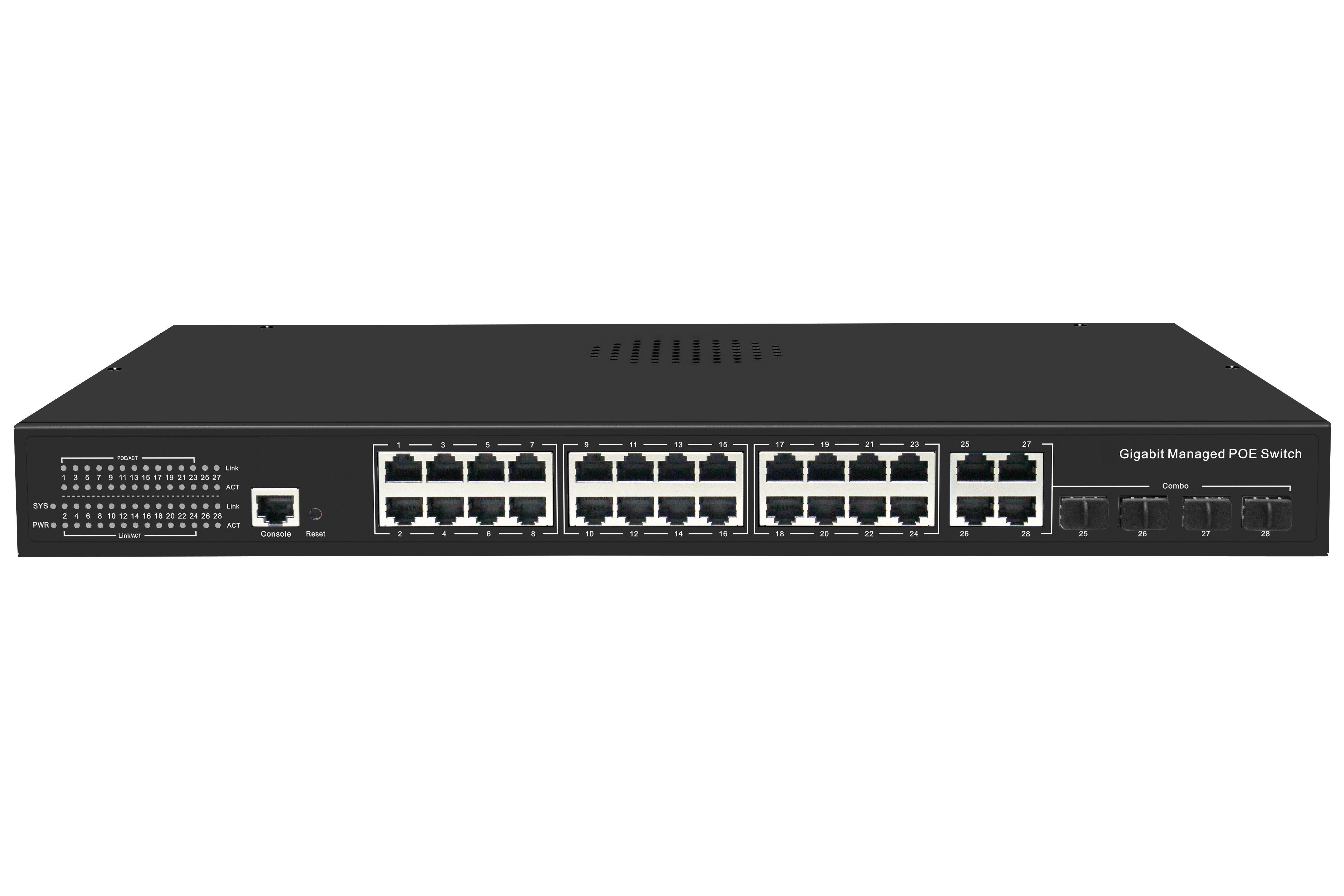 24 Gigabit PoE ports+8 Gigabit optoelectronic multiplexed SFP ports+4 Gigabit SFP optical ports+1 Conso network managed commercial grade POE switch