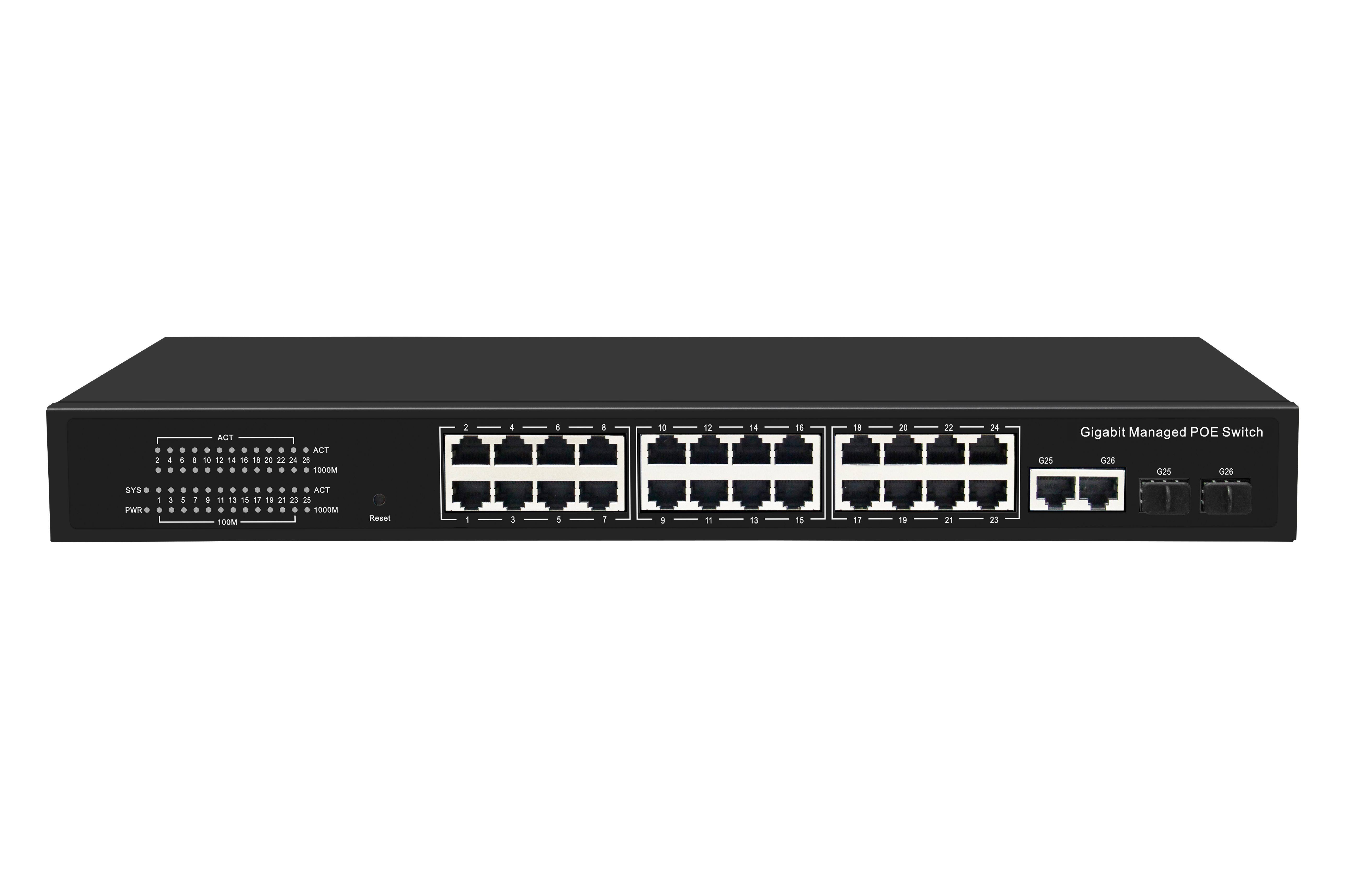 24 100Mbps POE ports+2 Gigabit uplink ports+2 Gigabit SFP optical port network management commercial grade POE switches